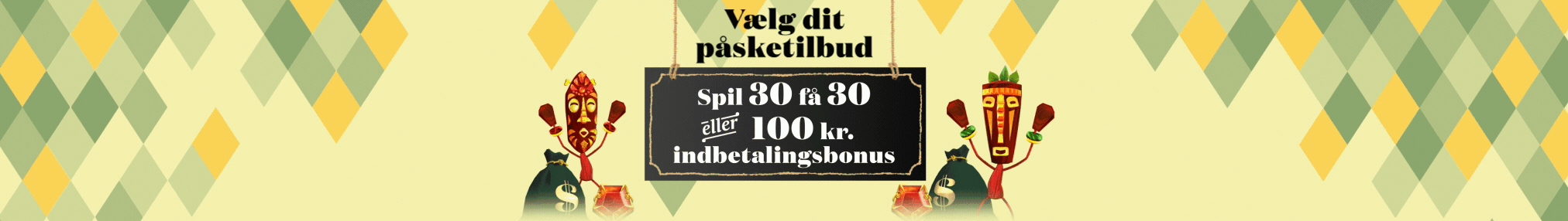 Gælder ml. d. 30. mar-3. apr. kan du vælge ml.: Tilbud 1: Indbetal og få op til 100 kr. i bonus. (Min. 50 kr. 10x omsætningskrav på indbetaling og bonus: (100 kr. + 100 kr.) x 10 = 2.000 kr. Kun spilleautomater) eller Tilbud 2: Spil 30 kr. på 12 Mask of Fire Drum Frenzy - få 30 EC (1 kr./stk.) til Gates of Olympus Super Scatter. Dit valg kan ikke ændres, og du kan kun benytte dit valgte tilbud én gang. Du har 60 dage til at benytte Ekstra Chancer el. opfylde gennemspilskravet. Min. 18 år. Kræver spilkonto. Øvrige vilkår gælder.